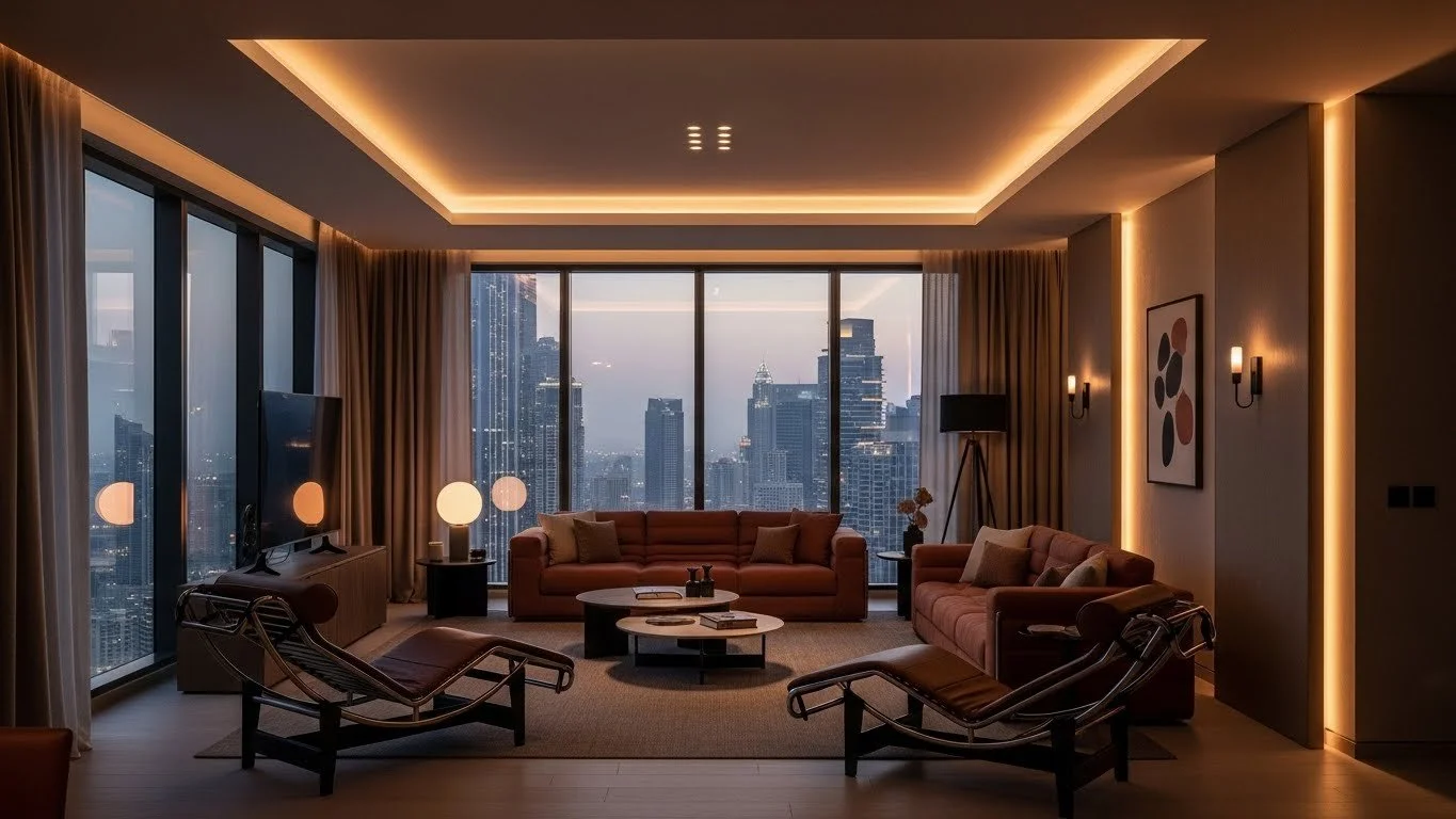 Instead of one illuminated statement wall, create depth through multiple light sources at different heights. Wall washers, uplights, table lamps, and concealed LED strips build complexity that a feature wall can never achieve.